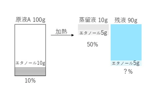 この原液Aを蒸留すると、蒸留液が10g、残液が90g得られます。