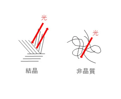 反対に非晶質は光が反射される界面が存在しないため、光は狙った方向に進みやすいです。このため、非晶質は光ファイバーに利用されています。