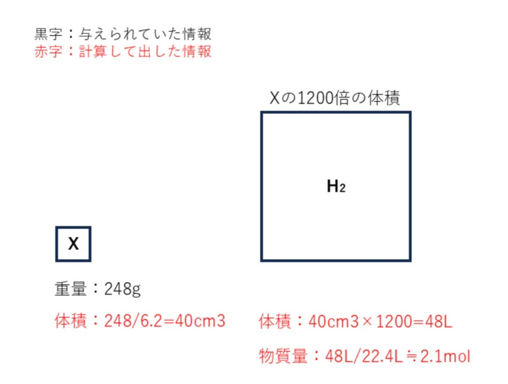 Xの密度は6.2g/cm3のため、Xの体積は248/6.2=40cm3になります。