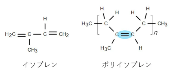 - 天然ゴムを空気中に放置しておくと、分子中の二重結合が酸化されて弾性を失う。
