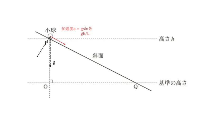 小球には重力gが働いており、重力gを斜面の進行方向に分解すると