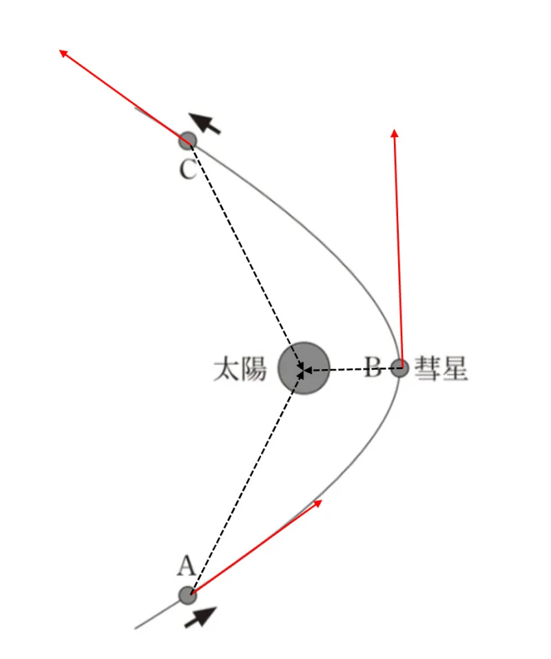 その為、太陽と彗星の距離が最も近いBで速度が最大となります。
