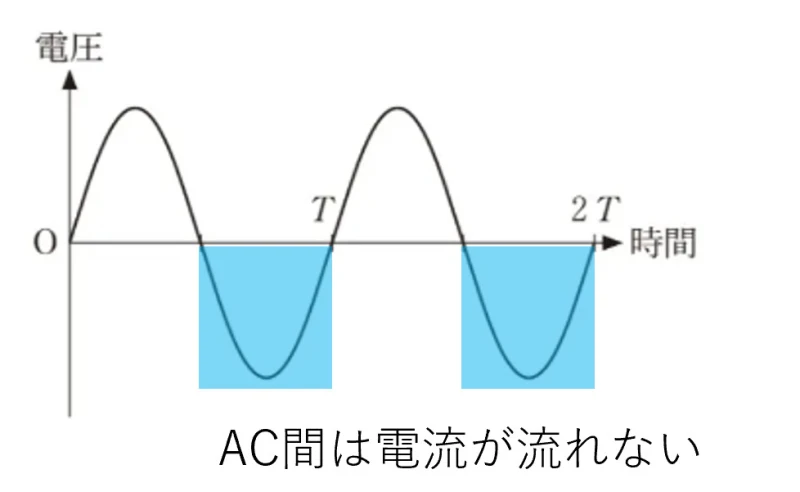 時間T/2~Tの期間と3T/2~2Tはダイオードに電流は流れず、電圧が0となります。