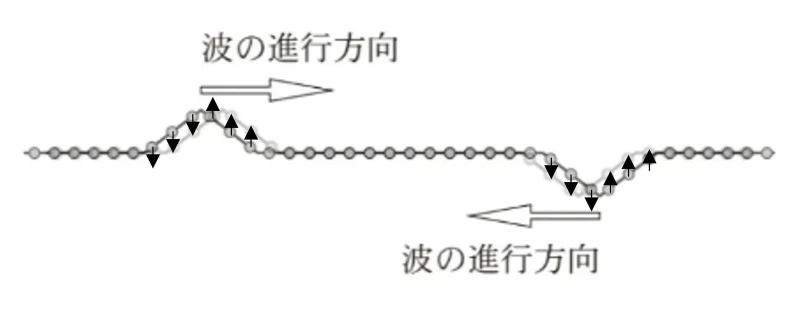 下図の透明な波形を少し時間が経過した後の波形とすると、現時点の波形からどの向きに移動しているかがわかります。